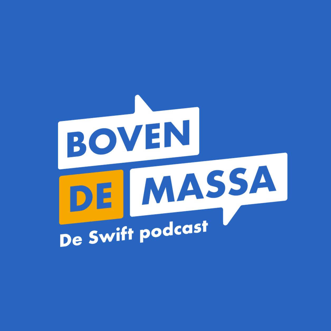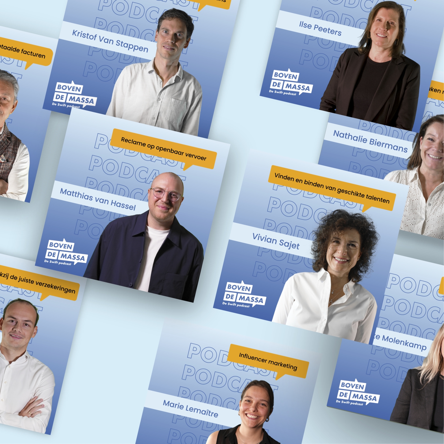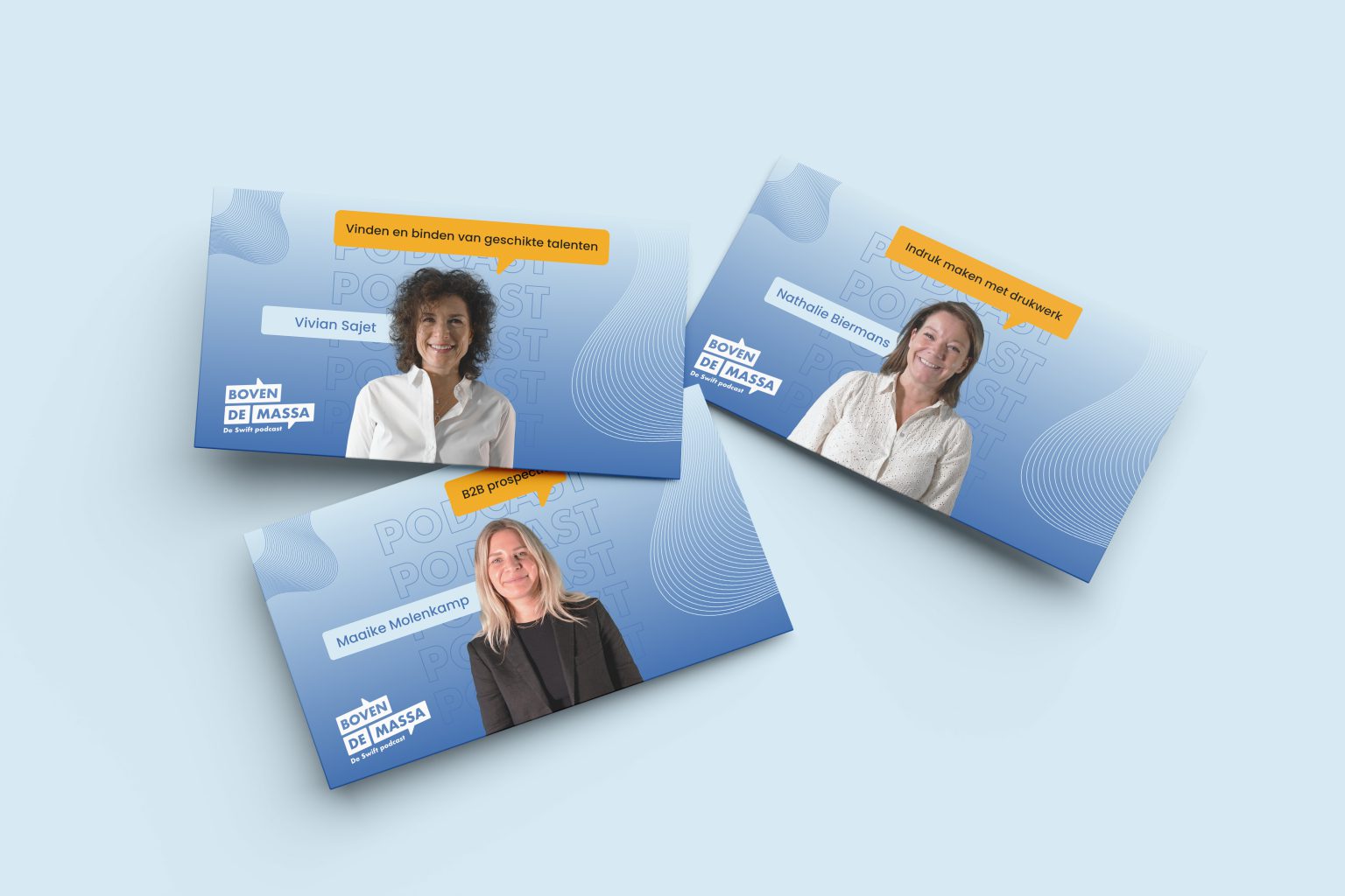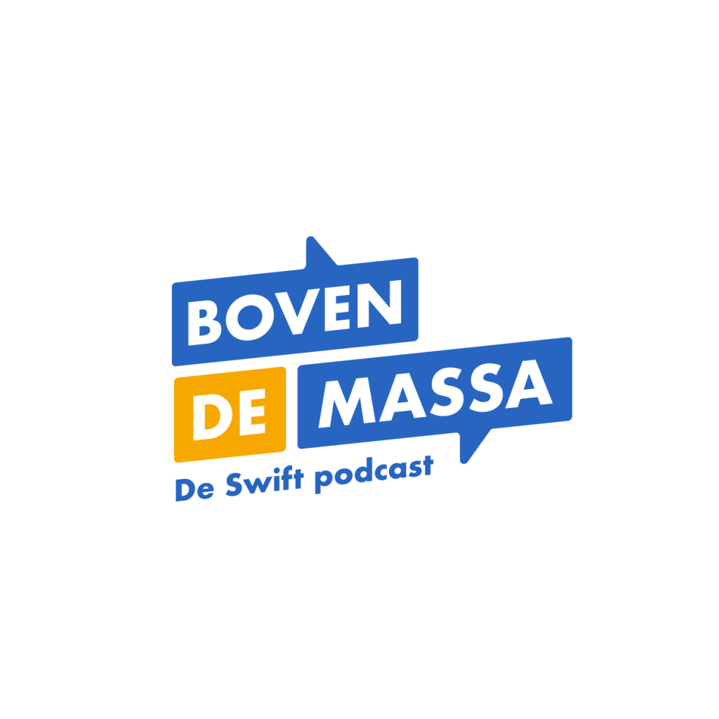 Het logo van Boven De Massa moest meteen duidelijk maken dat het om een podcast ging. Daarom werd gekozen voor het gebruik van tekstballonnen, die symbool staan voor gesprekken en interactie. Onder het logo werd de verduidelijking “De Swift podcast” toegevoegd om de link met Swift Marketing Agency te versterken. De kleurkeuze viel op een diepe blauwe tint, die nauw aansluit bij de huisstijl van Swift, aangevuld met een warme okerkleur en wit voor een dynamisch en onderscheidend contrast.
