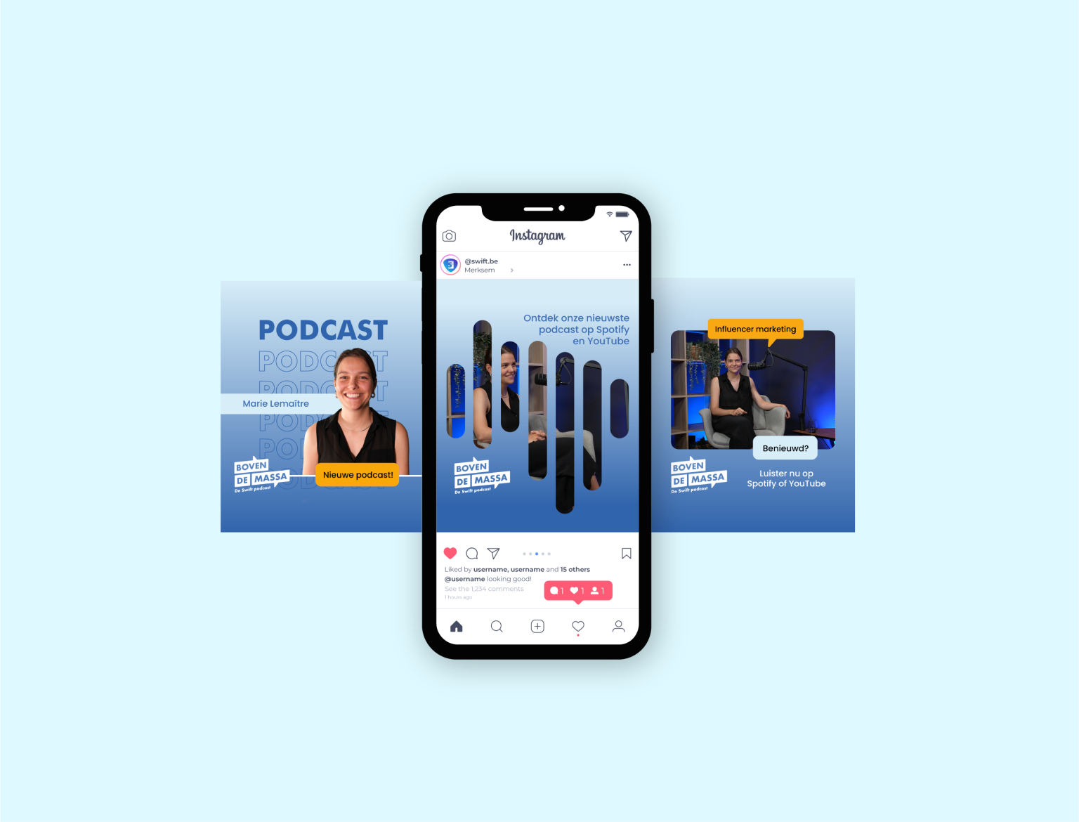 Voor Boven De Massa werd een carrousel ontworpen voor social media, specifiek voor Instagram, die wordt gepost wanneer een nieuwe aflevering live gaat. Elke carrousel is gepersonaliseerd naar de gast en het onderwerp van de aflevering, maar blijft altijd binnen de vaste huisstijl. Dit zorgt voor herkenbaarheid en consistentie, terwijl de inhoud toch uniek en relevant blijft voor de volgers.