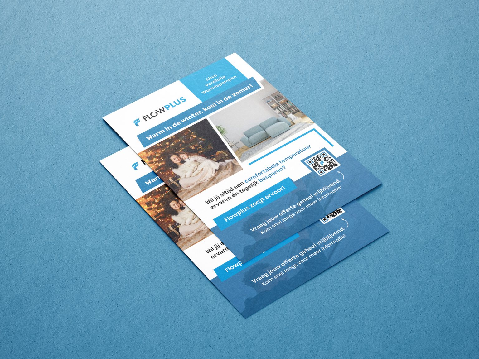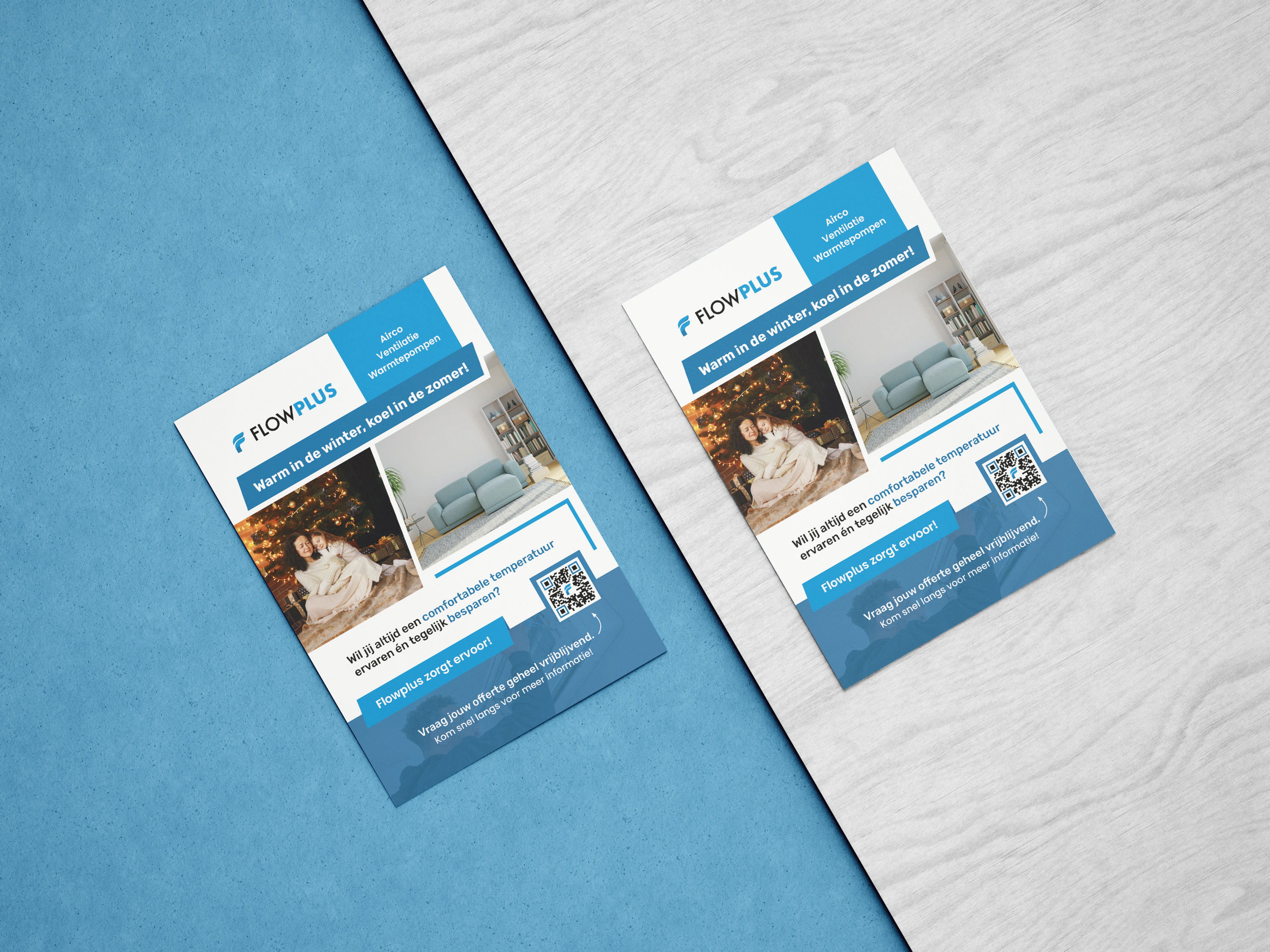 Voor Flowplus werd een informatieve en aantrekkelijke flyer ontworpen die hun aanbod aan warmte- en koeloplossingen in de kijker zet. De combinatie van winterse en zomerse beelden benadrukt de veelzijdigheid van hun systemen. Een overzichtelijke lay-out, heldere call-to-actions en een QR-code zorgen ervoor dat klanten eenvoudig meer informatie kunnen vinden of een vrijblijvende offerte kunnen aanvragen.